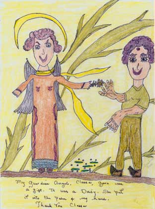One dark morning after a rain Annabella asked, "What have I been growing all winter long?" Her friend, the bison, came and said, "Corn." He showed Annabella a small lake in the shape of a heart with little shoots of green corn leaves sprouting up in the nearby earth.